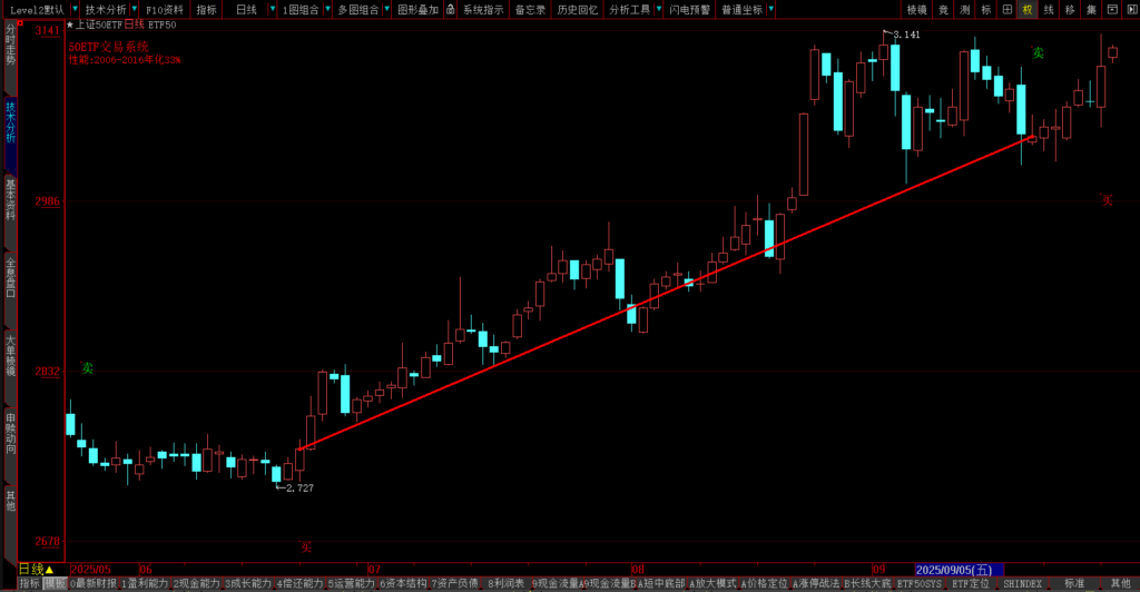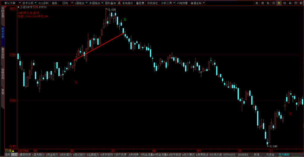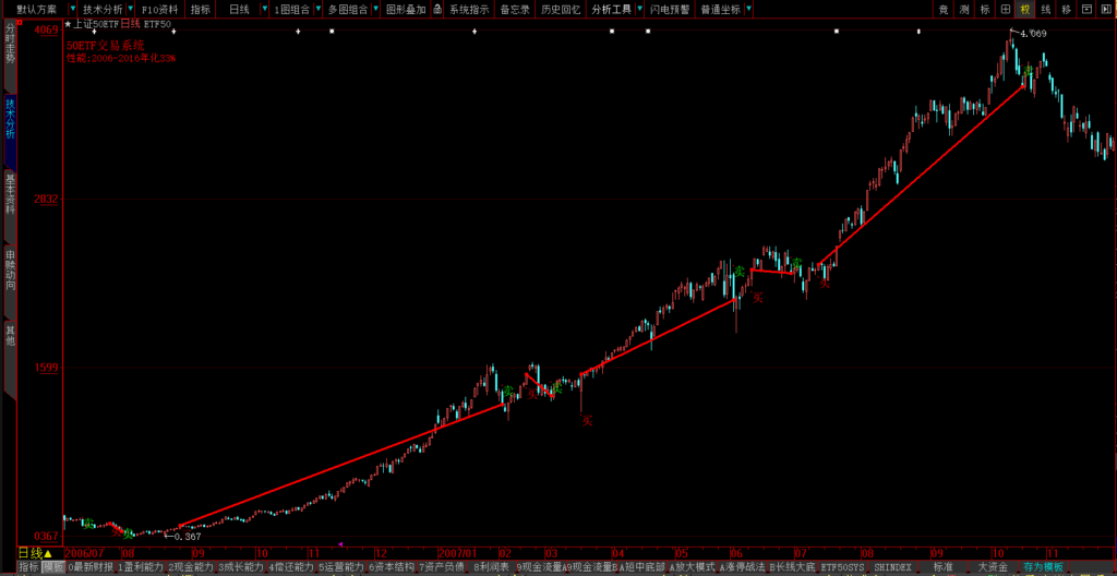 ETF50交易系统可以很好地跟踪趋势,在趋势行情中可以获得绝大部分利润,如2006-2007年的牛市: